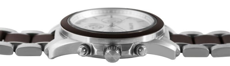 Das Gliederarmband aus Metall mit Holzelementen in den Farben Braun und Schwarz fügt sich harmonisch in das Gesamtbild ein und bietet durch die Edelstahl-Faltschließe einen sicheren Halt. Mit einer Gesamtlänge von 23 cm und einer Armbandbreite von 23 mm ist die Uhr ideal proportioniert für maskuline Handgelenke.