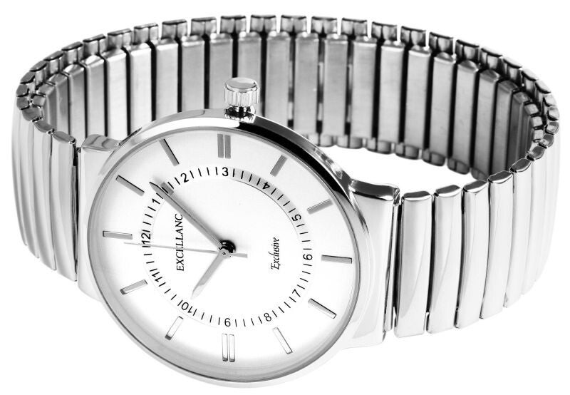 Die Excellanc Herrenuhr besticht durch ihre elegante und glänzende silberfarbene Optik. Das elastische Edelstahl-Zugarmband mit 20 mm Breite lässt sich bequem über das Handgelenk ziehen und passt sich perfekt an, während die Gesamtlänge von 20,5 cm optimalen Tragekomfort bietet.