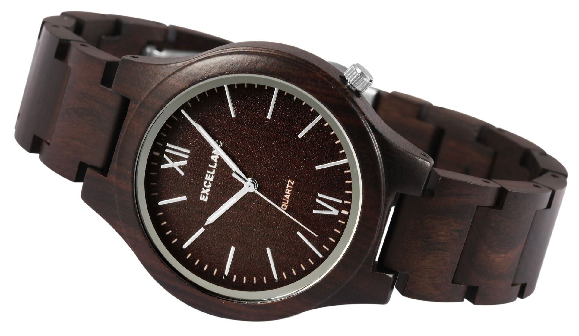 Die Excellanc Damen Armbanduhr aus edlem Zebraholz verbindet natürliche Schönheit mit stilvoller Modernität. Das feine Gliederarmband aus Holz lässt sich durch eine silberfarbene Edelstahl-Faltschließe sicher schließen und bietet durch herausnehmbare Elemente die Möglichkeit zur individuellen Anpassung. Mit einem Durchmesser von 40 mm und einer Gehäusehöhe von 11 mm wirkt das runde Holzgehäuse angenehm leicht und zugleich markant.