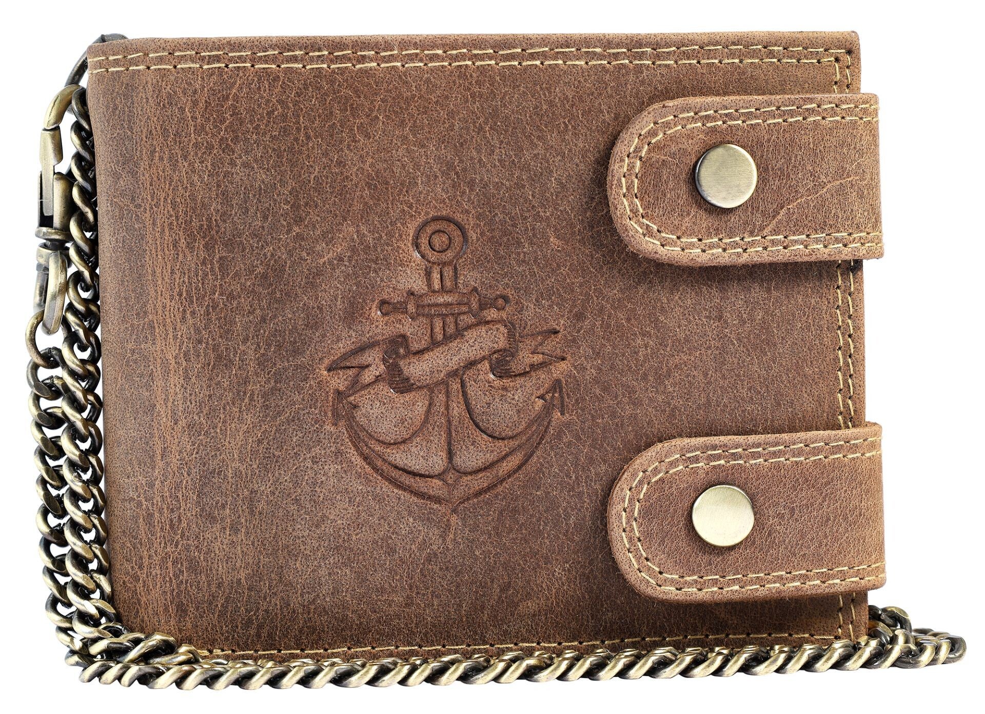 Ein besonderes Highlight ist die detailreiche Prägung auf der Vorderseite, die verschiedene Biker-Symbole wie Bike, Totenkopf, Adler oder Anker zeigt – ein echter Hingucker für alle, die ihre Persönlichkeit unterstreichen wollen. Abgerundet wird der Look durch die robuste Kette mit Karabiner (50 cm), die Ihre Geldbörse sicher und stilvoll an der Hose befestigt und den authentischen Biker-Style komplettiert.