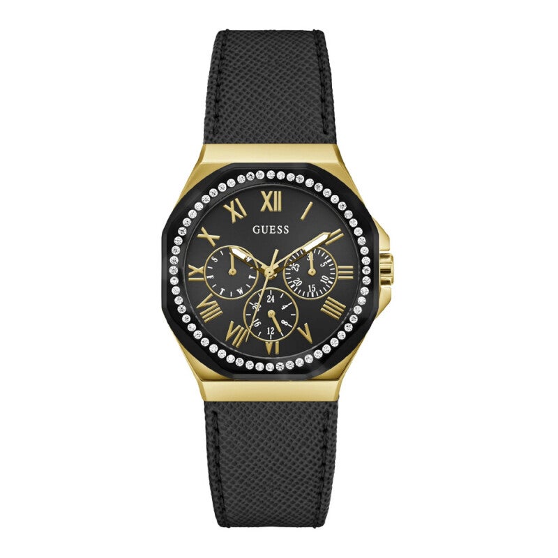 #GuessUhr, #GuessGlaze, #Damenuhr, #Multifunktionsuhr, #GoldSchwarzDesign, #Lederarmband, #Modeuhr, #Steinbesatz, #Luxuslook, #GuessStyle