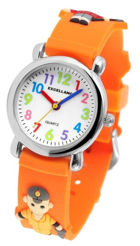 Die Excellanc Kinderarmbanduhr vereint spielerisches Design mit praktischer Funktionalität. Das silberfarbene Metallgehäuse mit Mineralglas schützt das präzise Quarzuhrwerk PC21 zuverlässig und macht die Uhr besonders robust für den Kinderalltag. Das orangefarbene Silikonarmband, verziert mit fröhlichen Handwerkermotiven, sorgt für komfortablen Tragekomfort und lässt sich dank der praktischen Dornschließe leicht öffnen und schließen.