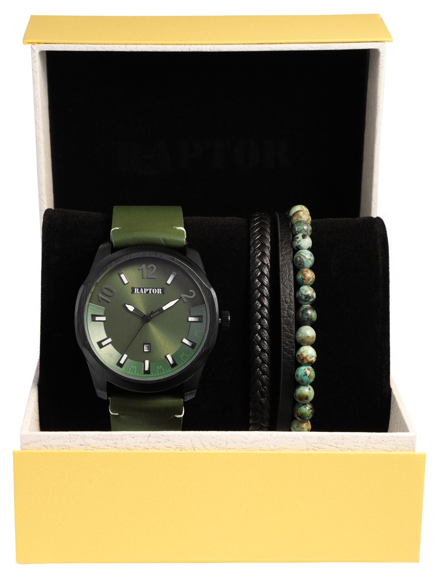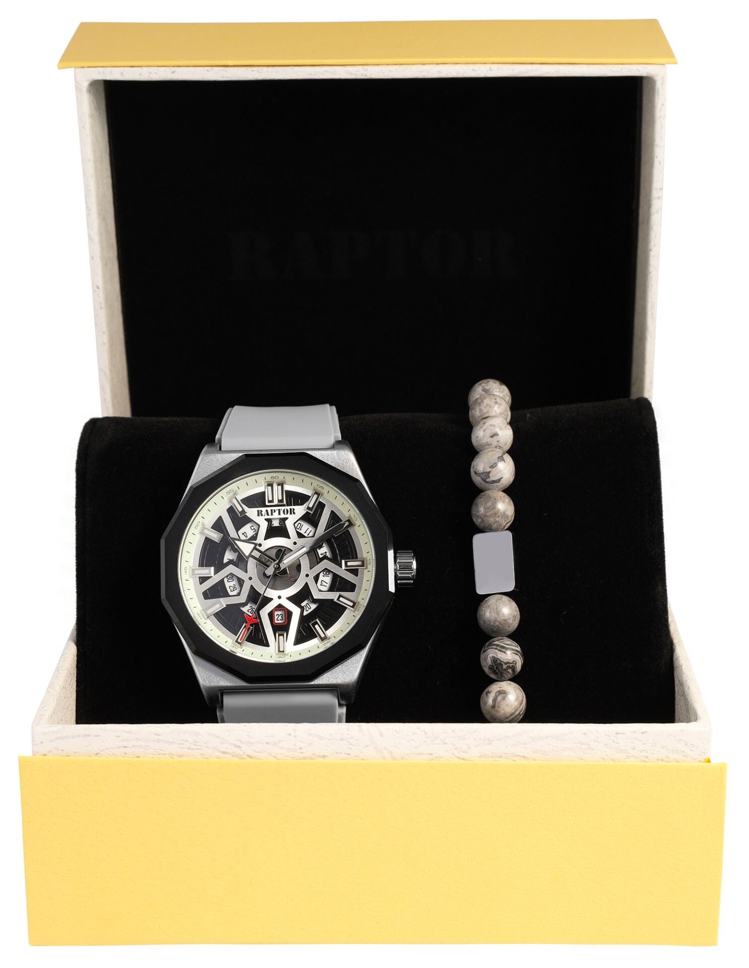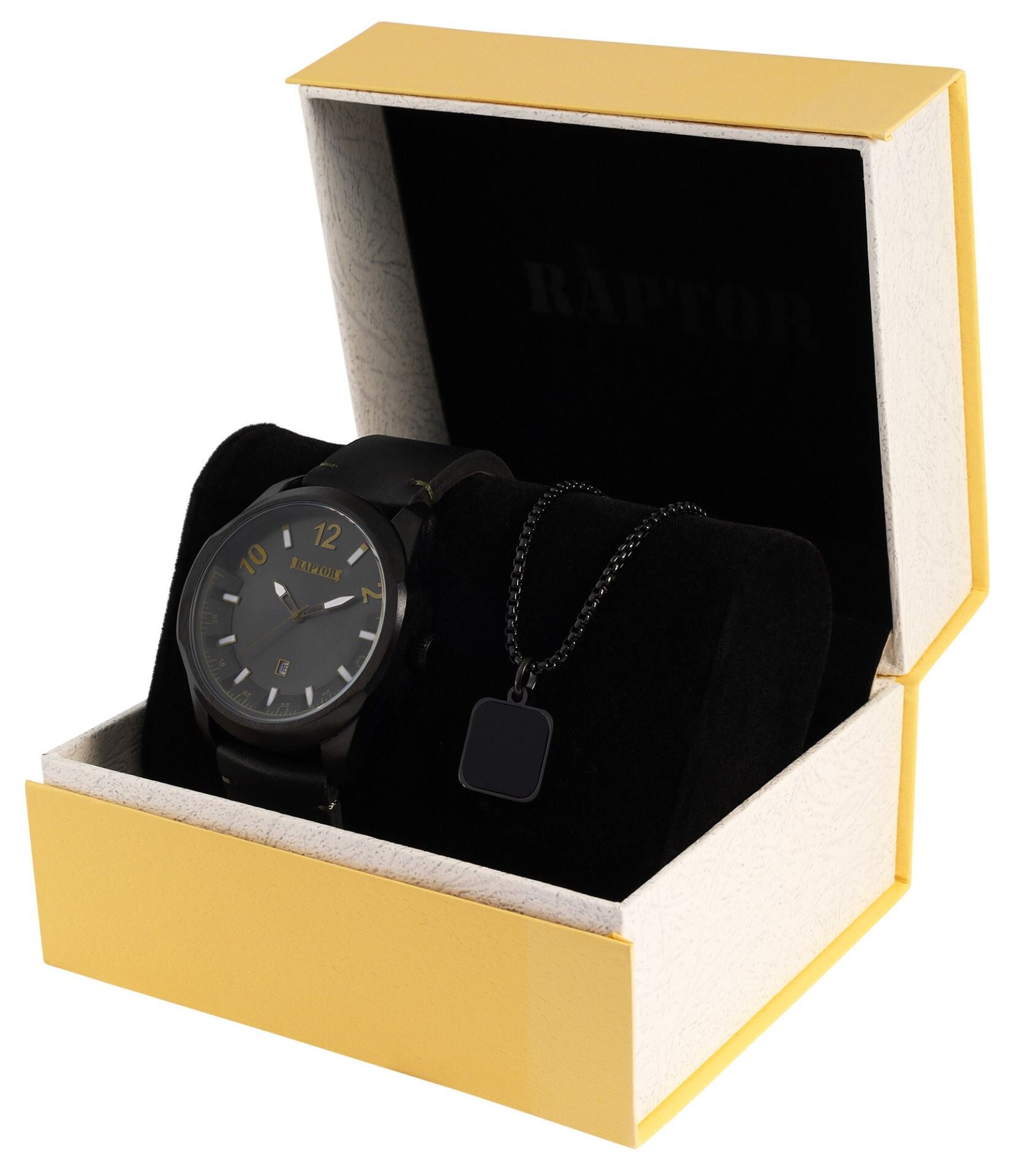 Raptor Herren Geschenkset – Herrenuhr mit Silikonband & Edelstahl-/Echtlederarmband