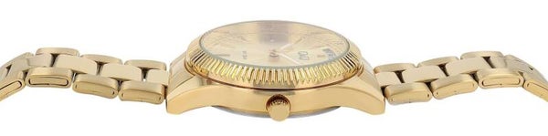 Im Inneren arbeitet ein hochwertiges Quarzuhrwerk, das für präzise Zeitmessung im Alltag sorgt. Das goldfarbene Zifferblatt mit goldfarbenen Strichindizes und Superluminova-beschichteten Zeigern ermöglicht eine gute Ablesbarkeit – auch bei schlechten Lichtverhältnissen. Besonders praktisch sind die Datumsanzeige auf drei Uhr sowie die Wochentagsanzeige in markantem Rot zwischen elf und ein Uhr, die der Uhr eine individuelle Note verleihen.