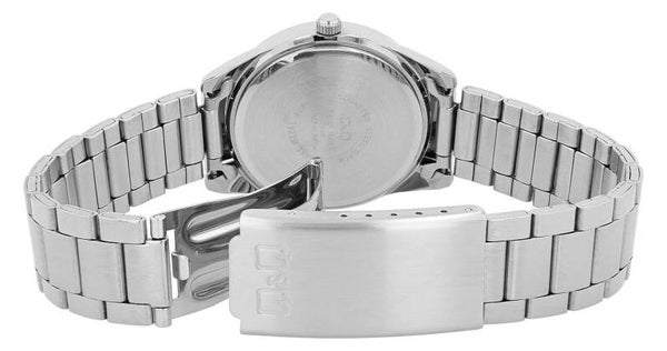 Die Q&Q Damenuhr von Q&Q – by Citizen Watch Co. LTD vereint zeitlose Eleganz mit zuverlässiger Funktionalität. Das silberfarbene Edelstahl-Gliederarmband ist robust, langlebig und dank herausnehmbarer Elemente individuell kürzbar, während die Edelstahl-Faltschließe für komfortables Tragen und sicheren Halt sorgt.