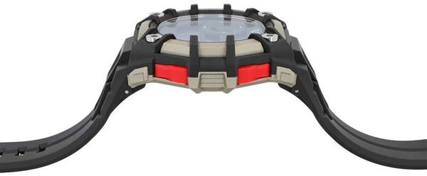 Das ergonomisch geformte, runde Kunststoffgehäuse mit Edelstahlboden liegt angenehm am Handgelenk. Das braune Silikonarmband mit Edelstahl-Dornschließe sorgt für sicheren Halt und hohen Komfort auch bei längerer Nutzung. Das strukturierte Digitalzifferblatt kombiniert graue Flächen, schwarze Indexe und markante rote Akzente; ein rundes Digital-Element in der oberen Hälfte setzt einen modernen Blickfang. Das hochflexible Kunststoffglas bietet zuverlässigen Schutz, auch bei erhöhtem Druck.