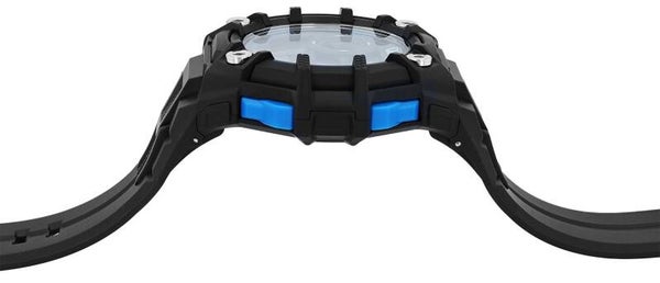 Das ergonomisch geformte, runde Gehäuse aus Kunststoff mit stabilem Edelstahlboden liegt angenehm am Handgelenk. Das schwarze Silikonarmband mit Edelstahl-Dornschließe sorgt für sicheren Halt und hohen Komfort, auch bei längerer Nutzung. Das strukturierte Digitalzifferblatt kombiniert graue Anzeigen, schwarze Indexe und blaue Akzente, ergänzt durch ein markantes rundes Digital-Element im oberen Bereich. Das hochflexible Kunststoffglas schützt das Display zuverlässig – selbst bei erhöhtem Druck.