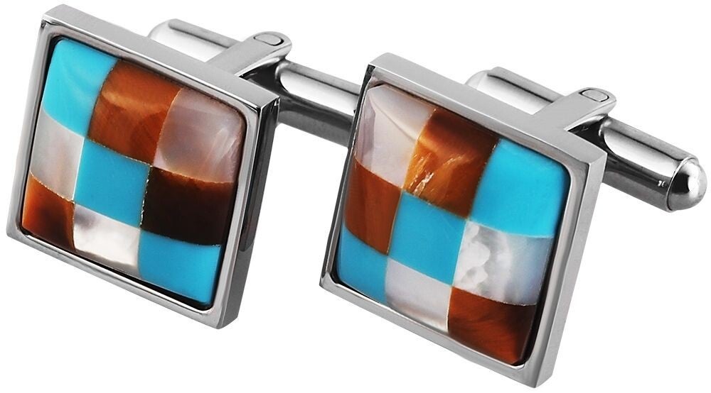 Die Akzent Manschettenknöpfe Mailo vereinen elegantes Edelstahl-Design mit dezenten farbigen Akzenten in Blau und Braun. Die quadratische Form und die kompakte Größe von 16 x 16 mm machen diese silberfarbenen Manschettenknöpfe zu einem zeitlosen Unisex-Schmuckstück, das jedem Outfit eine stilvolle Note verleiht. Hochwertiges Edelstahl-Material garantiert Langlebigkeit, stabilen Halt und eine edle Optik. Ein klassisches Accessoire, das Eleganz und moderne Farbakzente perfekt kombiniert.