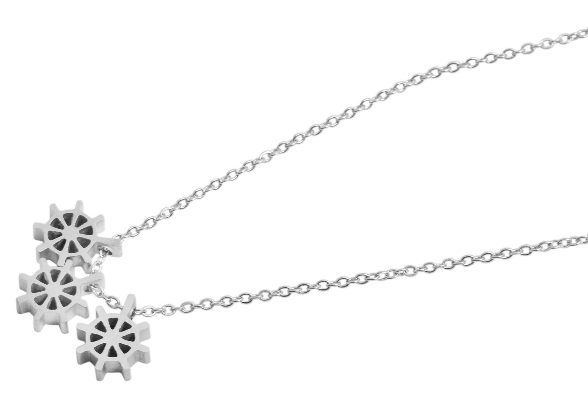 Der Anhänger der Kette besteht aus drei matt gebürsteten Edelstahlelementen – zwei in silberfarben, eines goldfarbig IPG-beschichtet – mit einem Durchmesser von 10 mm und einer Stärke von 3 mm. Zusammen ergeben sie eine Breite von 30 mm und eine Gesamtlänge von 10 mm, die dem Schmuckset eine moderne, stilvolle Ausstrahlung verleiht.