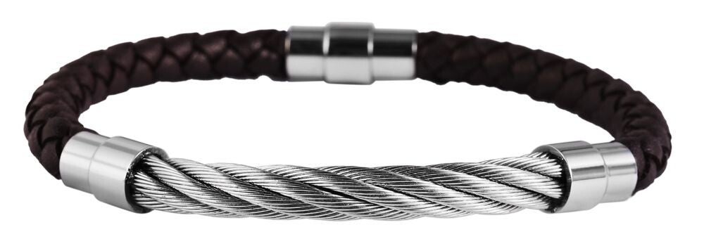 Das Akzent Echtlederarmband Nabil begeistert mit einer harmonischen Kombination aus geflochtenem Echtleder in Braun und einem markanten silberfarbenen Edelstahlelement. Das besondere Highlight dieses modischen Lederarmbands ist das mittig platzierte Element in Stahlseil-Optik, das dem Schmuckstück eine außergewöhnliche und zugleich maskuline Ausstrahlung verleiht.