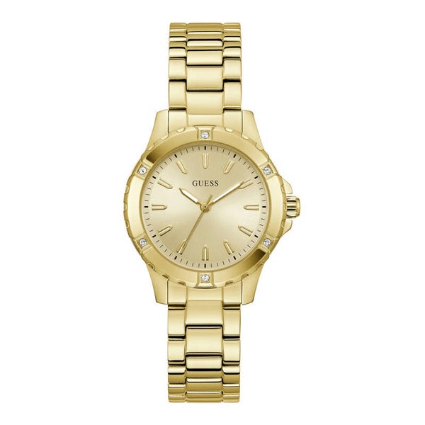 Das harmonisch abgestimmte goldfarbene Zifferblatt unterstreicht den luxuriösen Charakter dieser stilvollen Guess Uhr und sorgt für einen eleganten Gesamtlook. Im Inneren arbeitet ein präzises Quarzuhrwerk, das zuverlässige Zeitmessung mit modernem Design verbindet. Diese Markenuhr für Damen eignet sich perfekt für besondere Anlässe, elegante Abendlooks oder als glänzendes Highlight im Alltag.